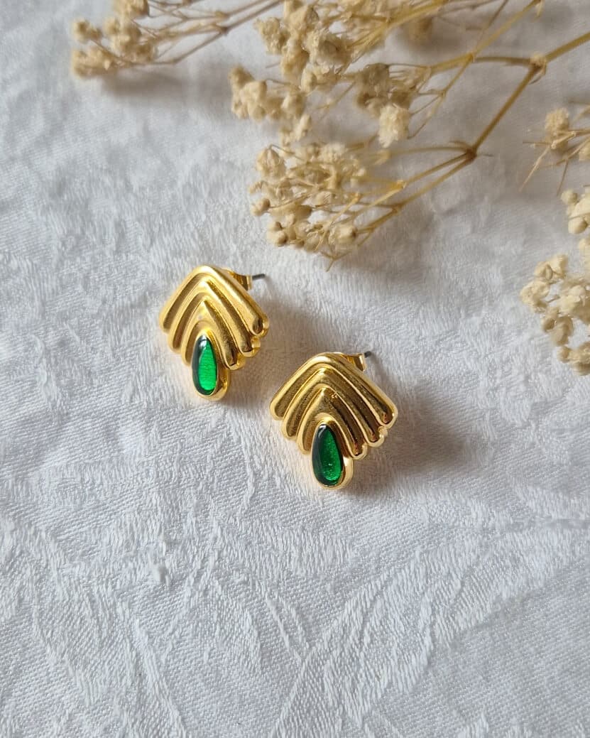 Les boucles d’oreilles Art Déco sont disponibles en vert ou en rose.
